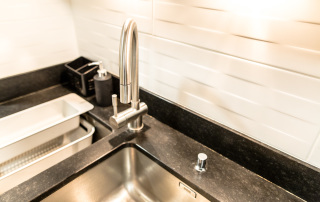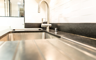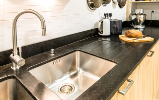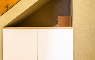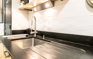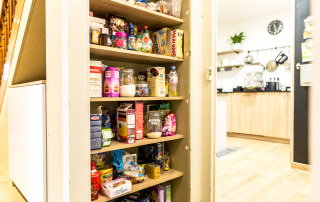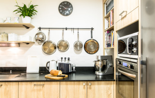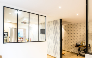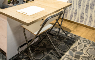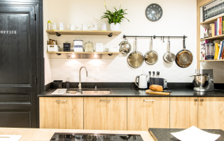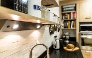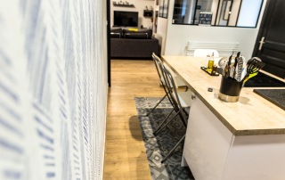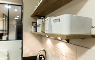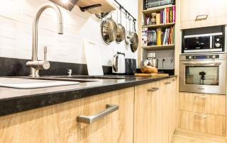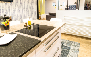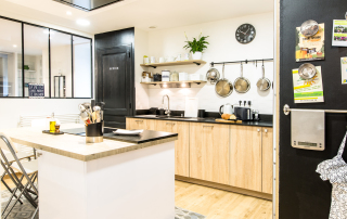 Cuisine Natura chêne bordolino clair & Mirage blanc neige, une cuisine TEISSA où le maître mot est convivialité. En campagne lyonnaise, projet de réhabilitation d’une maison d’hôtes dont la cuisine a été confiée à MJ Home. Pièce centrale du rez de chaussée et ne bénéficiant pour autant d’aucune fenêtre donnant sur l’extérieur, cette pièce est lumineuse et conviviale. Une ancienne porte de la maison a été récupérée sur ma proposition et trouve sa seconde vie dans la pièce. Les clients l’ont repeinte en noir. Elle laisse croire à une ouverture sur cellier mais n’est qu’un leurre, proposé pour camoufler le tableau électrique. Elle s’associe au noir du plan de travail en granit zimbabwe effet cuir qui se trouve côté évier. . Les 2 cuves inox de chez Franke sont complétés par un mitigeur à mousseur de la même marque qui permet d’utiliser tantôt une cuve, tantôt l’autre avec l’allonge du flexible. Deux étagères en finition chêne bordolino se positionnent juste au dessus, agrémentées de multiples objets de décos achetés ou chinés. Ces étagères ont été prévues d’une certaine longueur afin de laisser la place à la crédence de casseroles qui n’était jusqu’alors pas mise en valeur dans cette pièce. Sous les étagères, une applique triangulaire en métal brossé vient apporter tout l’éclairage nécessaire au dessus des cuves. Le granit repose sur des meubles Natura en mélamine finition chêne bordolino clair de la marque Cuisines TEISSA, se prolonge et finit sa course dans une niche d’angle qui permet aux robots de rester brancher et d’être utilisés régulièrement sans encombrer le plan de travail. D’autres petites étagères finissent l’angle et permettent aux livres de cuisine de trouver leur place. Le retour d’armoires avec le four et le réfrigérateur prolonge l’accès à la pièce qui reçoit les hôtes et qui se compose de grandes baies vitrées, invitant à la fois la campagne dans la maison et la lumière ! La cuisson, elle, est intégré à un îlot en modèle Mirage finition blanc neige brillant, également des Cuisines TEISSA. Le plan de cet îlot a été préféré en stratifié car les 4 membres de la famille y mangent tous les jours et trouve son aspect plus chaleureux au toucher que le granit. Le stratifié est d’autant plus chaleureux car il a été proposé en imitation chêne et fait ainsi un joli rappel aux façades en chêne bordolino. Enfin trois des appareils électroménagers hauts de gamme trouvent leur place dans cette cuisine et en sont des pièces maîtresses : le four Kitchenaid, le réfrigérateur combiné Liebherr et le groupe aspirant Novy encastré dans une soffite : une invitation à de succulents repas et de beaux moments de partages autour de cet îlot où il fait bon prendre place !