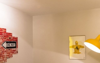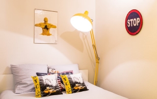Des imprimés sur métal aux formes de panneaux signalétiques ajoutent une note d’originalité « so british » dans la chambre. La lampe de chevet rouge et le lampadaire jaune rythment le mur où vient s’appuyer le lit.
