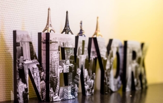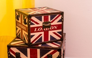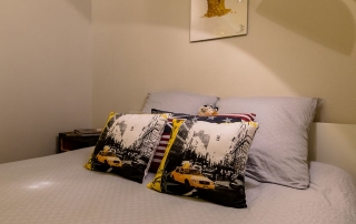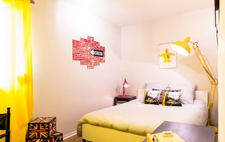 Pour réaliser cette chambre, peu de mobilier souhaité : un bureau métallisé indus, une commode en bois effet métal surmonté d’un taxi New Yorkais jaune, un lit aux lignes pures mais parés de coussins reprenant le fameux taxi en accord avec le chevet. Deux jolies malles portant le drapeau anglais viennent compléter le mobilier ; malles servant de coffres à jouets.