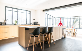 Dans une maison en rénovation complète, le projet de cuisine a été intégré à l’ensemble de l’agencement du rez de chaussée qui s’est présenté en volume unique suite à la suppression de toutes les cloisons, ne laissant que l’escalier comme séparation entre le salon et le séjour/cuisine.