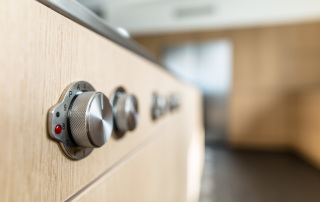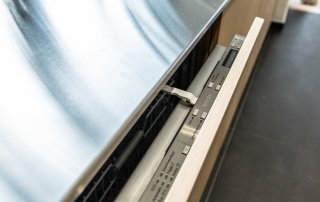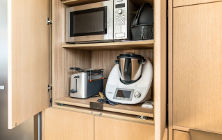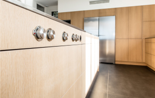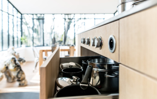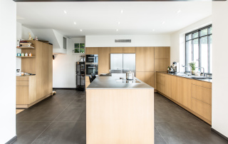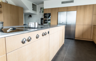 Les meubles de la cuisine ont été conçus en chêne huilé sans noeuds et sans poignées. A la place de passage de main connu des modèles sans poignées, ce sont les tiroirs Legrabox qui ont été préférés pour conserver les façades les plus pures possibles. Les intérieurs en Legrabox sont haut de gamme en tout inox véritable.