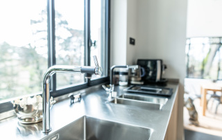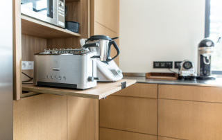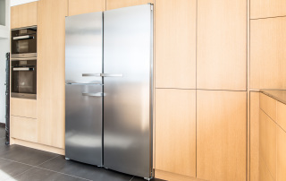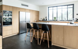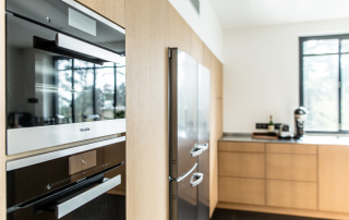 Le chêne en façade de meuble fait une jolie redondance au côté naturel du parquet collé de l’ensemble du reste du rez de chaussée, bien que la finition de ce parquet donne l’impression qu’il a toujours été là. Le chêne, avec son esprit chaleureux, est associé dans la cuisine à deux matériaux très contemporain et froid : l’inox et le verre. Ces deux matériaux sot présents dans les appareils électroménager des marques MIELE & BORA. Le réfrigérateur side by side s’impose par ses dimensions et la pureté de ses lignes tandis que le verre laqué noir des fours MIELE réveille l’inox des ses faaçdes. Le choix des mitigeurs a également créée un jeu de matières et de formes. Bien qu’ils proviennent de deux marques différentes : BLANCO et FRANKE, leur design s’inscrit dans n esprit de tuyauterie chromé, qui révèle chacun à leur façon une partie en noir ; créant un rappel élégant au jeu de matériaux de cette cuisine.
