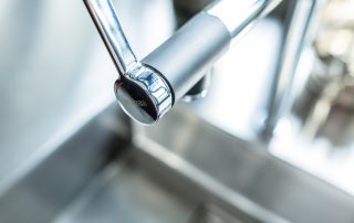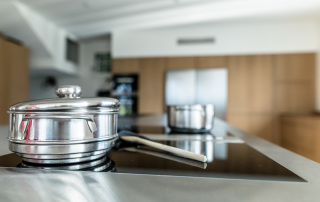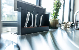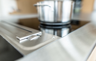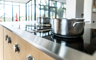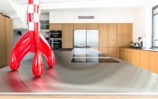 Le plan de travail a également été traité en inox, finition brossée . Les deux cuves de la gamme Centinox de chez Franke ont été soudées parfaitement au plan, donnant l’impression de ne faire qu’unes avec ce dernier.Les 2 plaques induction domino BORA en verre laqué noir ont été intégrées à fleur du plan. La gamme professionnelle de la marque BORA présente des boutons en inox véritable, très maniables, qui se positionnent en façade sur le tiroir supérieur du casserolier. Ces boutons apportent une touche esthétique à l’ensemble et peuvent s’associer à des prises de même dimension, discrètes et très pratiques. La hotte de plan BORA en inox a également trouvée sa place entre les deux plaques. Cette hotte assure une aspiration efficace pour une cuisine agréable dans une grande pièce de vie ouverte.