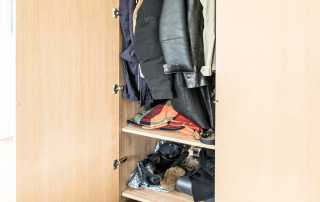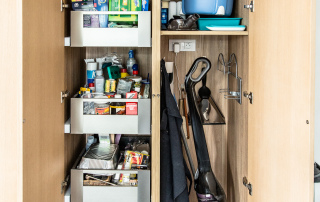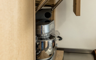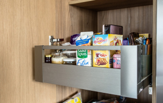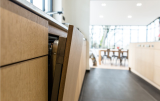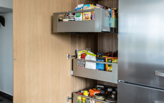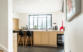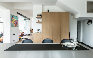 Le dernier ensemble d’armoire de la cuisine qui a trouvé sa place sur le mur de l’escalier, a une fonction toute particulière : le placard – dressing qui se trouve habituellement dans des entrées d’appartement ou maison. Sans mur au niveau du rez de chaussée, cette proposition a ravi les clients dont l’ensemble a offert un meuble vide-poche, une armoire penderie & chaussures, une autre destinée aux produits ménagers & une dernière pour les balais et aspirateurs. Cet ensemble fait un pendant à l’autre linéaire d’armoires de la partie technique de la cuisine & offre un bel ensemble avec le chêne qui prédomine en hauteur sur le pourtour de la pièce.