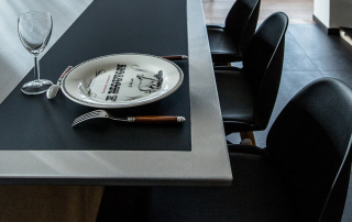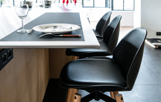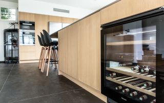 L’îlot est une pièce maîtresse de la cuisine par ses dimensions majestueuses : 365 cm de long par 115cm de largeur. C’est le verre noir qui délimite les espaces sur le plan : les plaques induction pour la zone cuisson et un verre trempé laqué mat noir pour le coin repas. Cet espace a été volontairement positionné à l’opposé de la partie cuisson afin de rythmer la plan . La dernière pièce noire de la cuisine est la cave à vins qui invite le visiteur à découvrir la cuisine en se positionnant en bout d’îlot, dans la perspective offerte du salon.