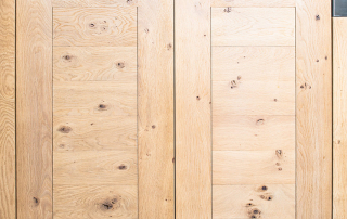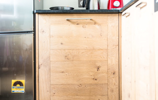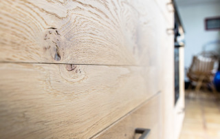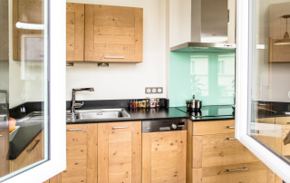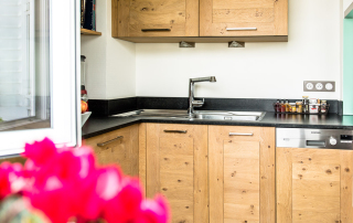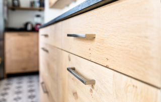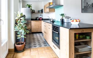 Une cuisine en chêne à noeuds de la Cuisine Française, modèle Variation en finition huilée blanchie pour un appartement de Lyon 7ième de caractère. Des matériaux authentiques tels que le parquet en chêne plein de charme & des carreaux ciment plein de souvenirs ; récupérés de la maison familiale, s’associent parfaitement au chêne à noeuds des meubles & au granit noir des plans de travail.