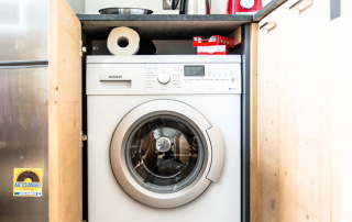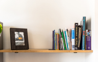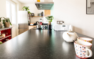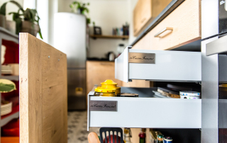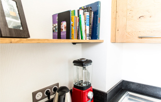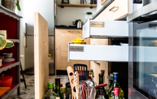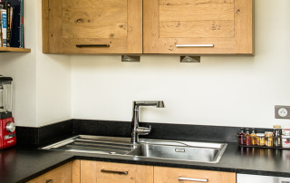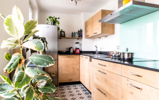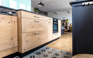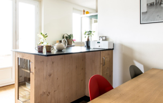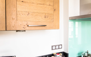 Les tabourets et la table des clients faite sur mesure en plateau chêne et en structure métallisée amènent un caractère industriel à l’ensemble. Nous avons renforcés cet ambiance en optant pour des socles en médium noir et des consoles métallisées noires pour l’étagère. Cette étagère épure le fond de cuisine et le décore avec les livres de cuisine et des cadres. Au métal noir s’associe l’inox que l’on retrouve sur la hotte aérienne, sur l’évier de chez Franke et son égouttoir ainsi que sur les éclairages et les poignées.