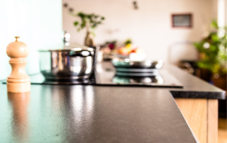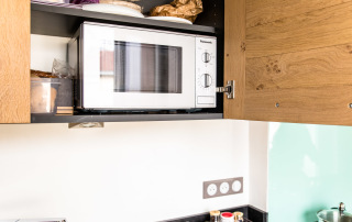 La cuisine a été ouverte sur la pièce de vie : une bonne idée des clients qui ont supprimés la cloison. Nous devions l’intégrer discrètement et avons dissimulés les postes techniques de lavage dans le retour prévu initialement à cet effet et avons ouvert sur la pièce un beau plan de travail qui dévoile le début de la cuisson. Le plan intègre un élément bas vitré, pour la vaisselle, dans un esprit de buffet avec un coin repas prêt à accueillir 2 tabourets d’ïlot.