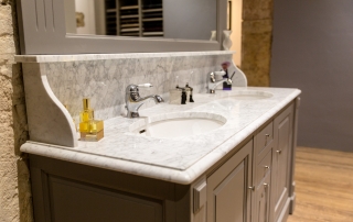 Meuble vasque de style, inspiré du mobilier Louis XVI avec les pilastres ornés de triglyphes et de cabochons, et la moulure des façades typique de ce style. L’art de l’ébénisterie dans toute sa splendeur avec le corps du meuble constitué d’un cadre assemblé en tenon et mortaise,comme la façade intitulée Vendôme. Les finitions sont identiques à celles d’un meuble à part entière comme un buffet ou une commode : l’ensemble est ainsi réalisé avec un socle en applique mouluré.