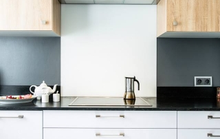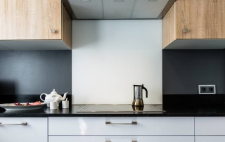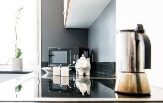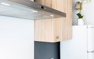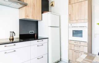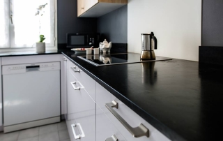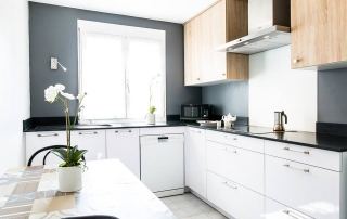 Cuisine TEISSA de fabrication française composée des modèles MIRAGE & NATURA en stratifié blanc neige brillant & mélamine structurée chêne bordolino clair. Le plan de travail en granit noir adouci et ses crédences assorties contrastent avec les façades blanches. Le fond de cuisson en verre laqué blanc illumine cette pièce qui de part son exposition est inondée de lumière le matin. Un ensemble très actuel et contemporain que la finition brossée de la hotte et de la quincaillerie accentue.